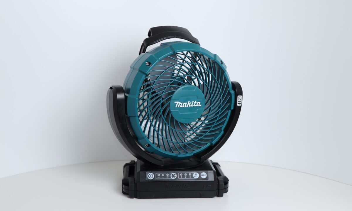 マキタ18Vシリーズ(14.4Vバッテリーも使用可能)の充電式ファンで、サーキュレーターのように羽根の直径程度の狭い範囲で風を遠くまで送るファンです。
